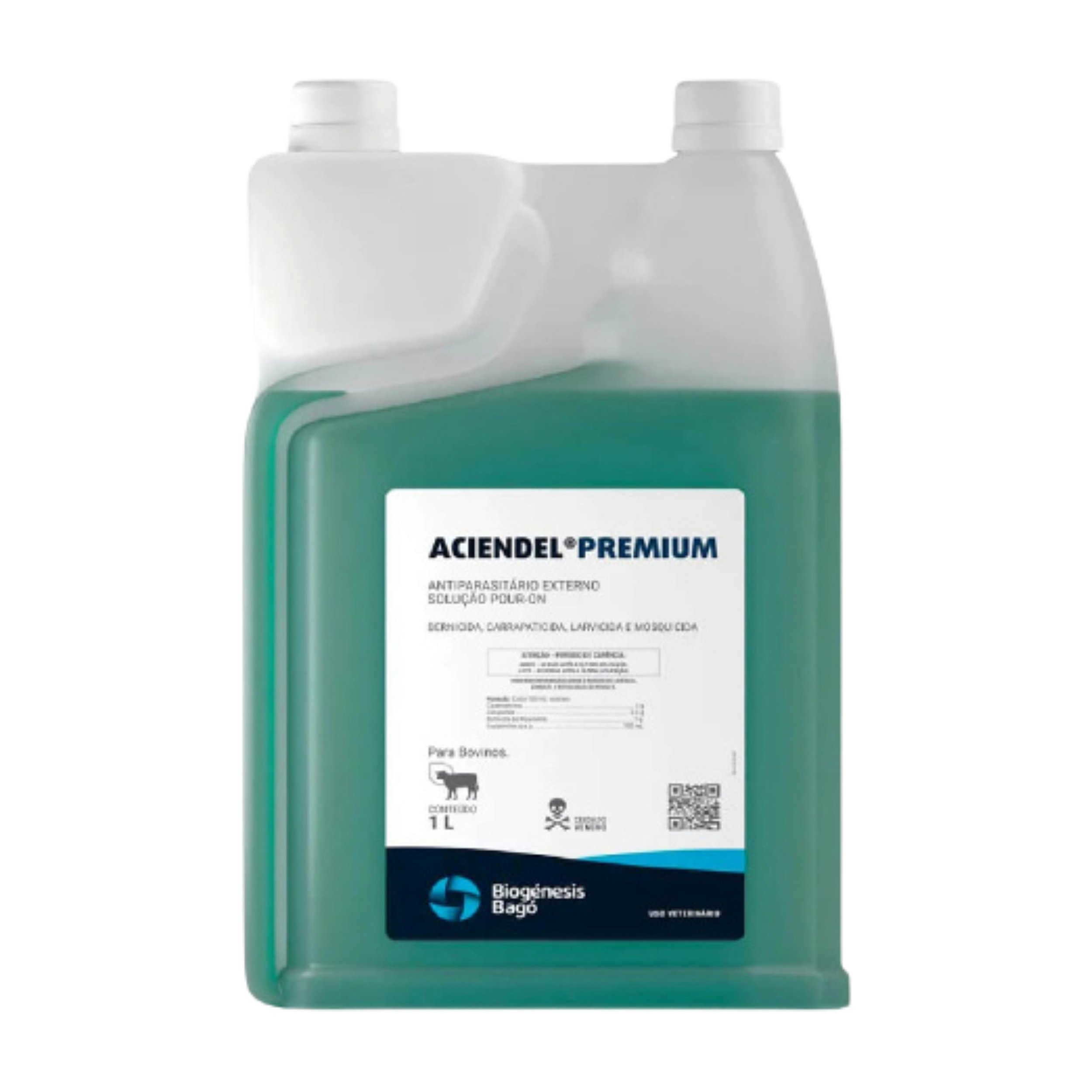 Aciendel Premium é indicado para tratamento de infestações por berne, carrapato, mosca-dos-chifres e miíase em bovinos.