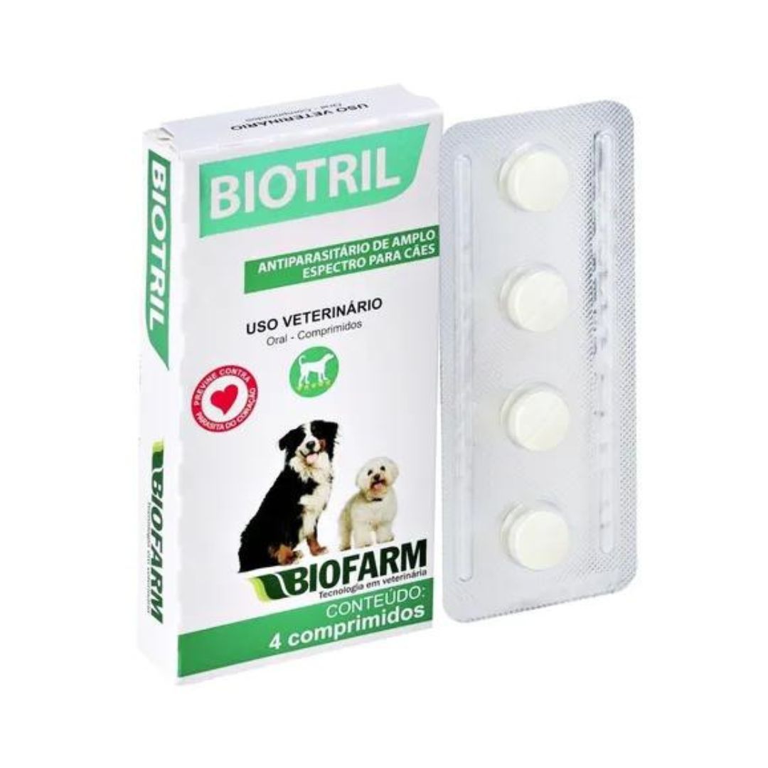Biotril é indicado para cães na prevenção dos seguintes parasitas, dirofilariose, elimina os estágios tissulares da larva de Dirofilaria immitis (verme do coração) até 30 dias após a infestação.