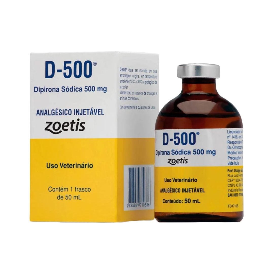 É indicado no tratamento das dores do sistema muscular, esquelético e visceral, influenciando outrossim o alívio das inflamações e dos estados febris. D-500 Dipirona é recomendado para todas as espécies animais no combate à dor das cólicas, feridas, após intervenções cirúrgicas, durante o parto, nas inflamações das articulações; como anti-pirético nos estados febris. Acalma a intranquilidade e rebeldia dos animais, principalmente dos equinos. Não possui ação narcótica nem esteróidica.