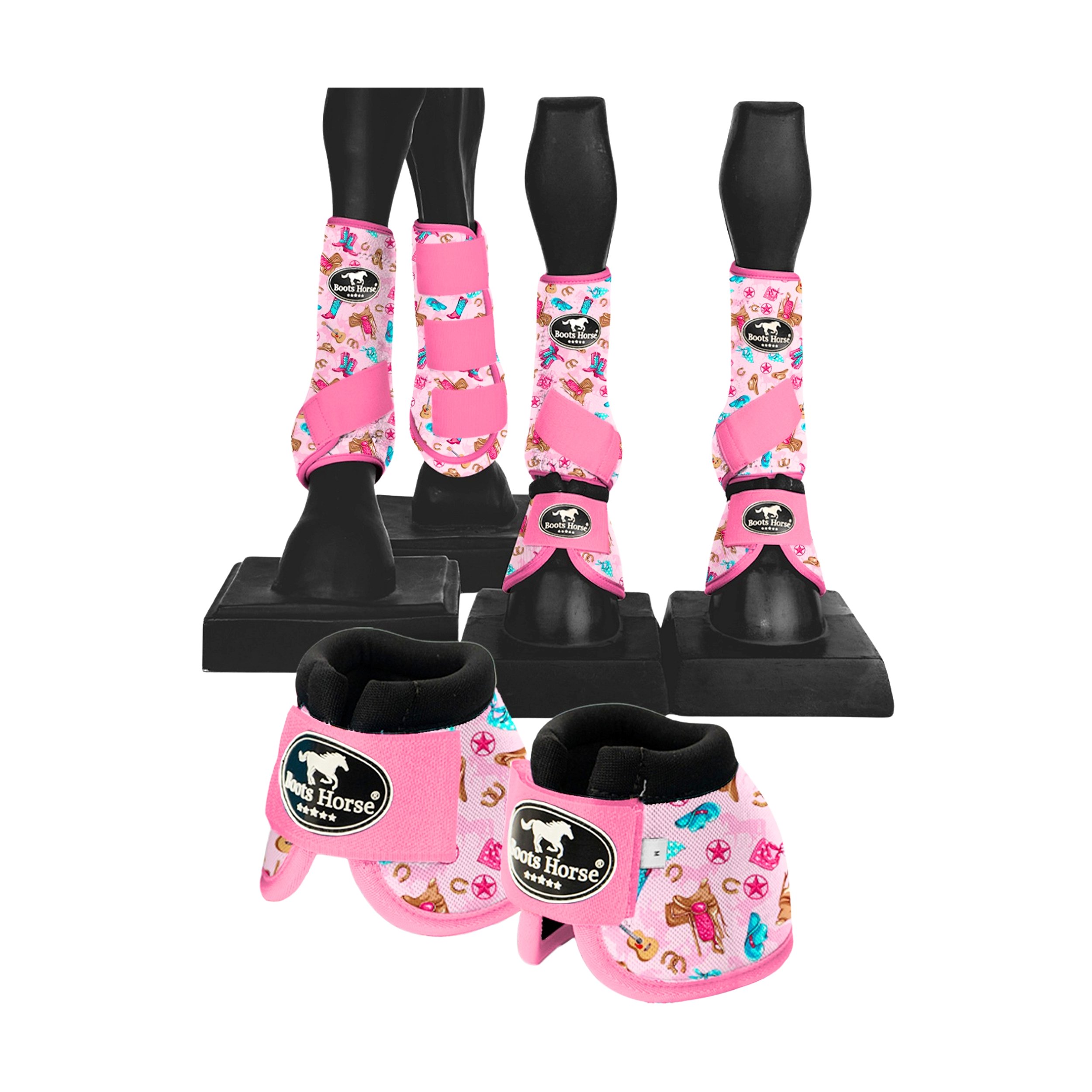 O conjunto é composto por um par de Boleteiras dianteiras, um par de Boleteiras traseiras e um par de Cloches dianteiros, os quais são recomendados para garantir a proteção das patas sem abrir mão do estilo, com as cores características da marca Boots Horse.