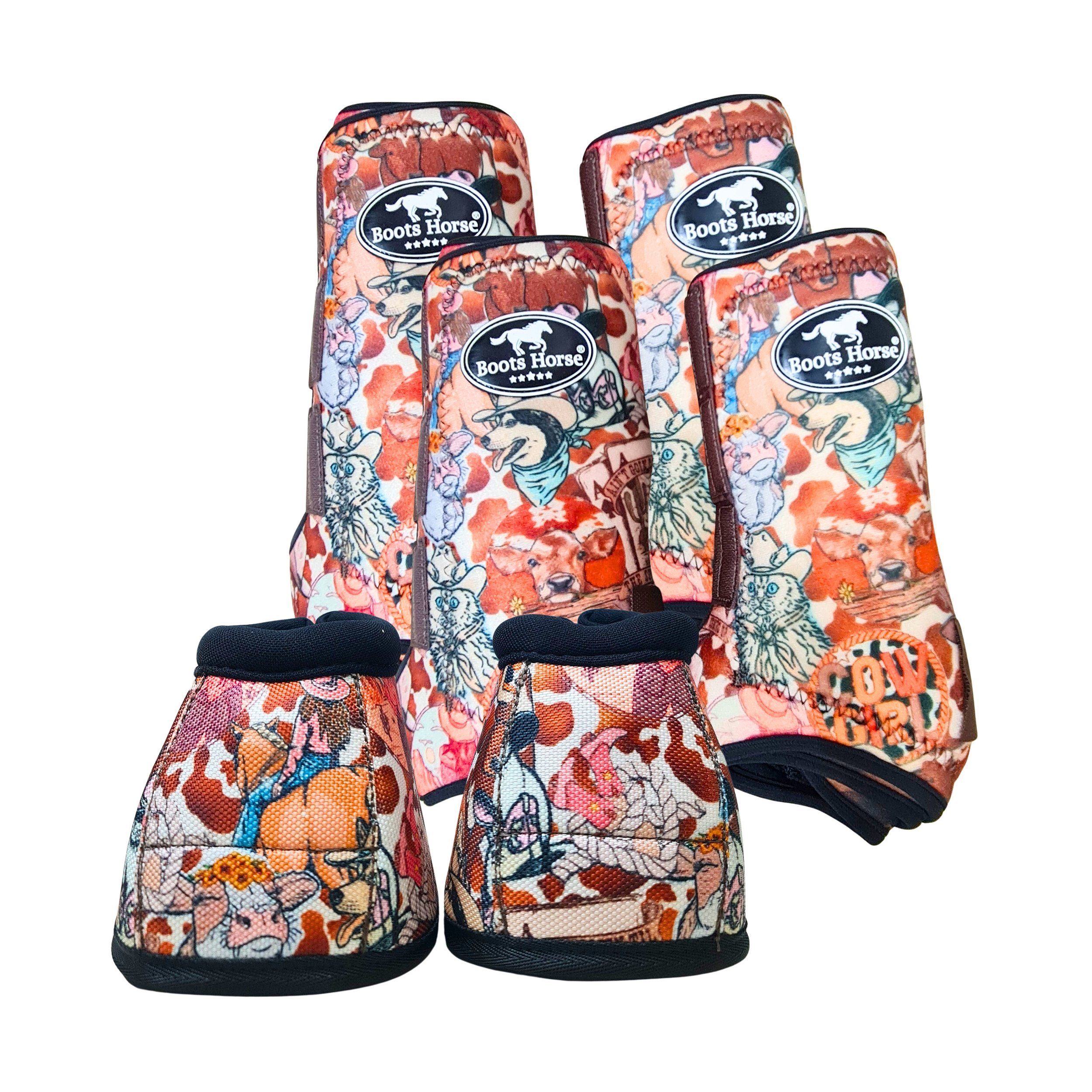 O conjunto é composto por um par de Boleteiras dianteiras, um par de Boleteiras traseiras e um par de Cloches dianteiros, os quais são recomendados para garantir a proteção das patas sem abrir mão do estilo, com as cores características da marca Boots Horse.