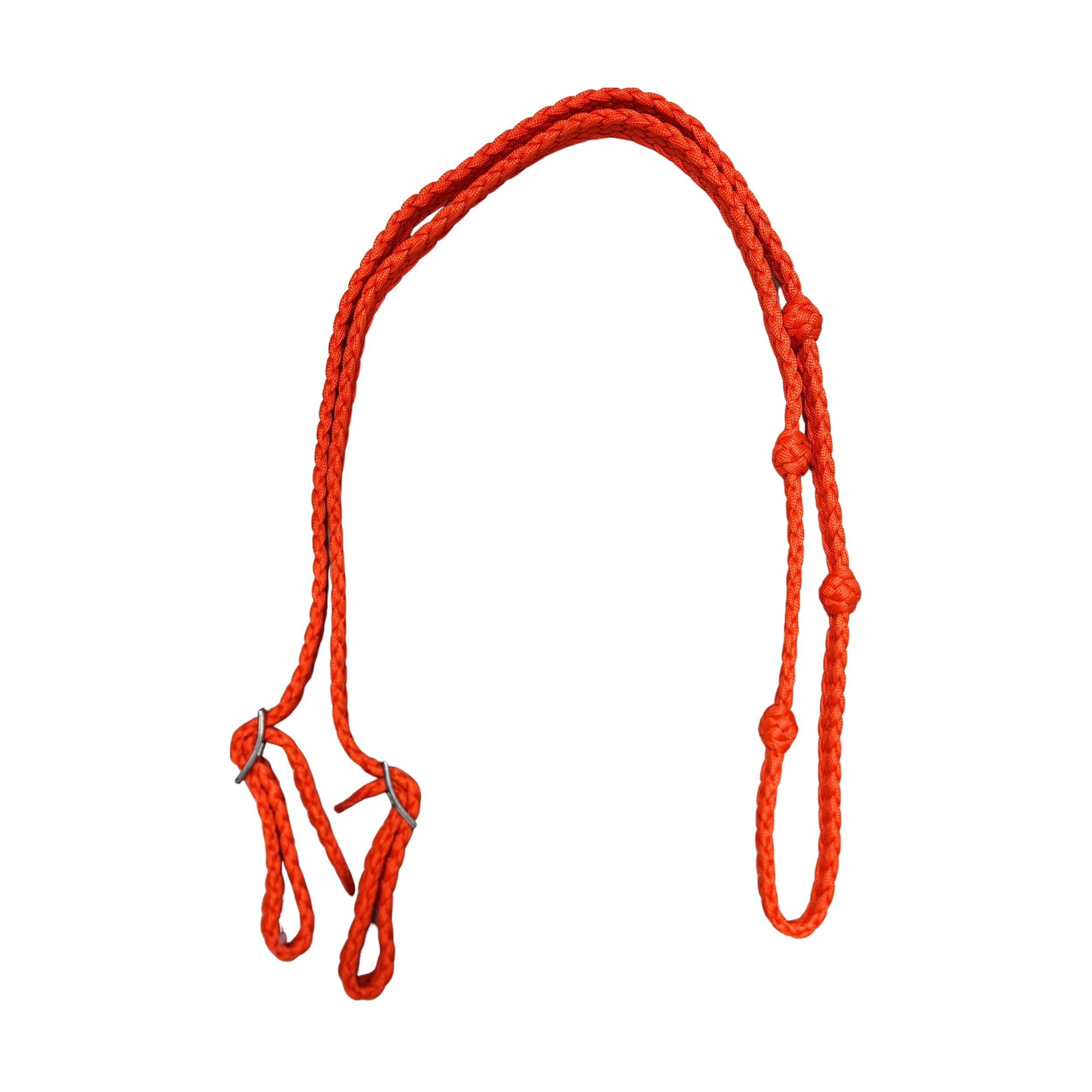 Rédea confeccionada em nylon com tranças de 8 tentos, cana chata nas ponteiras com fivelas canoa com banho prata para regulagem e no centro cana quadrada com 4 nós.